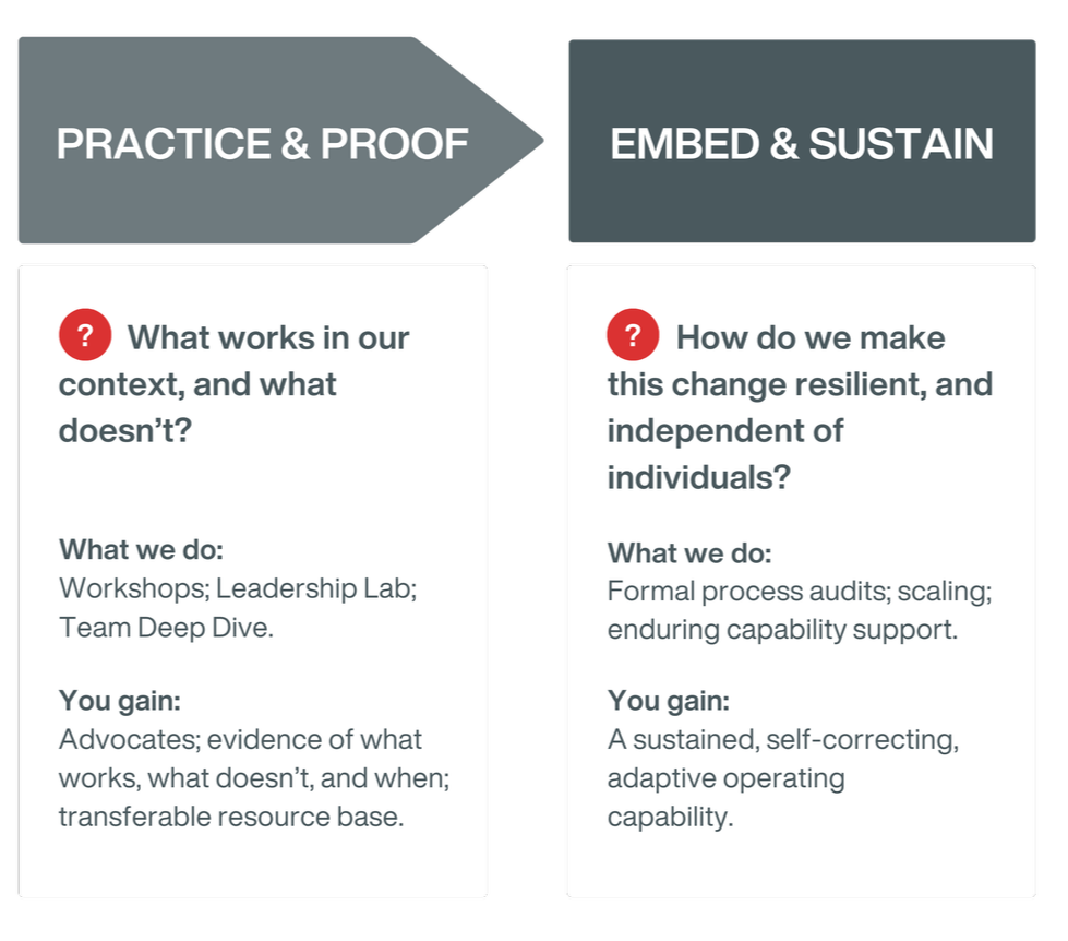 When this gap persists, pressure gets absorbed through extra effort, informal workarounds, and a few people carrying too much of the load, until that informal capacity is overwhelmed and delivery risk begins to emerge.