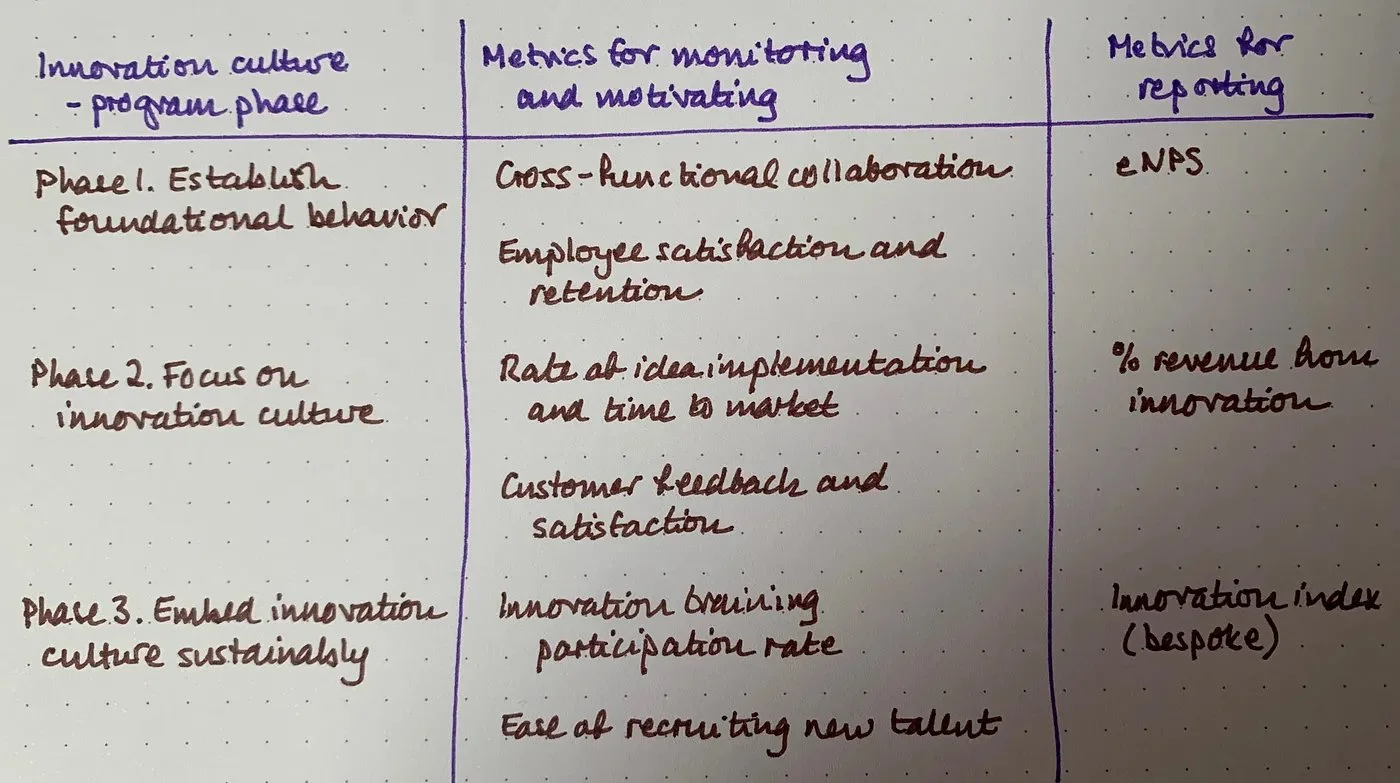 This goal will require a significant program in any organization, whose current culture and innovation status will determine the exact phases and workstreams, and, in turn, what is measured. But let’s imagine that the program is structured like this: